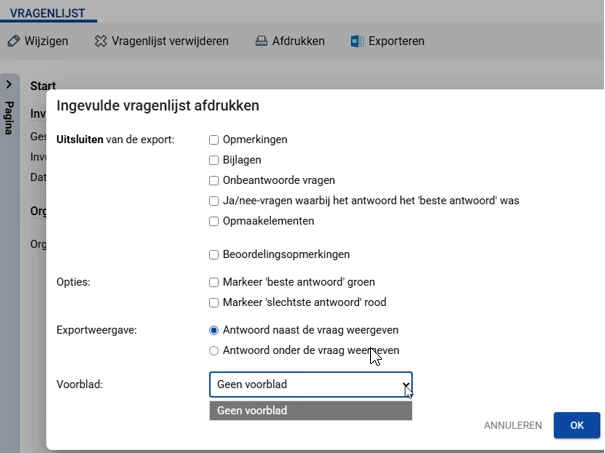 Hoe pas ik een voorblad aan voor het afdrukken van een vragenlijst? Zie screenshot