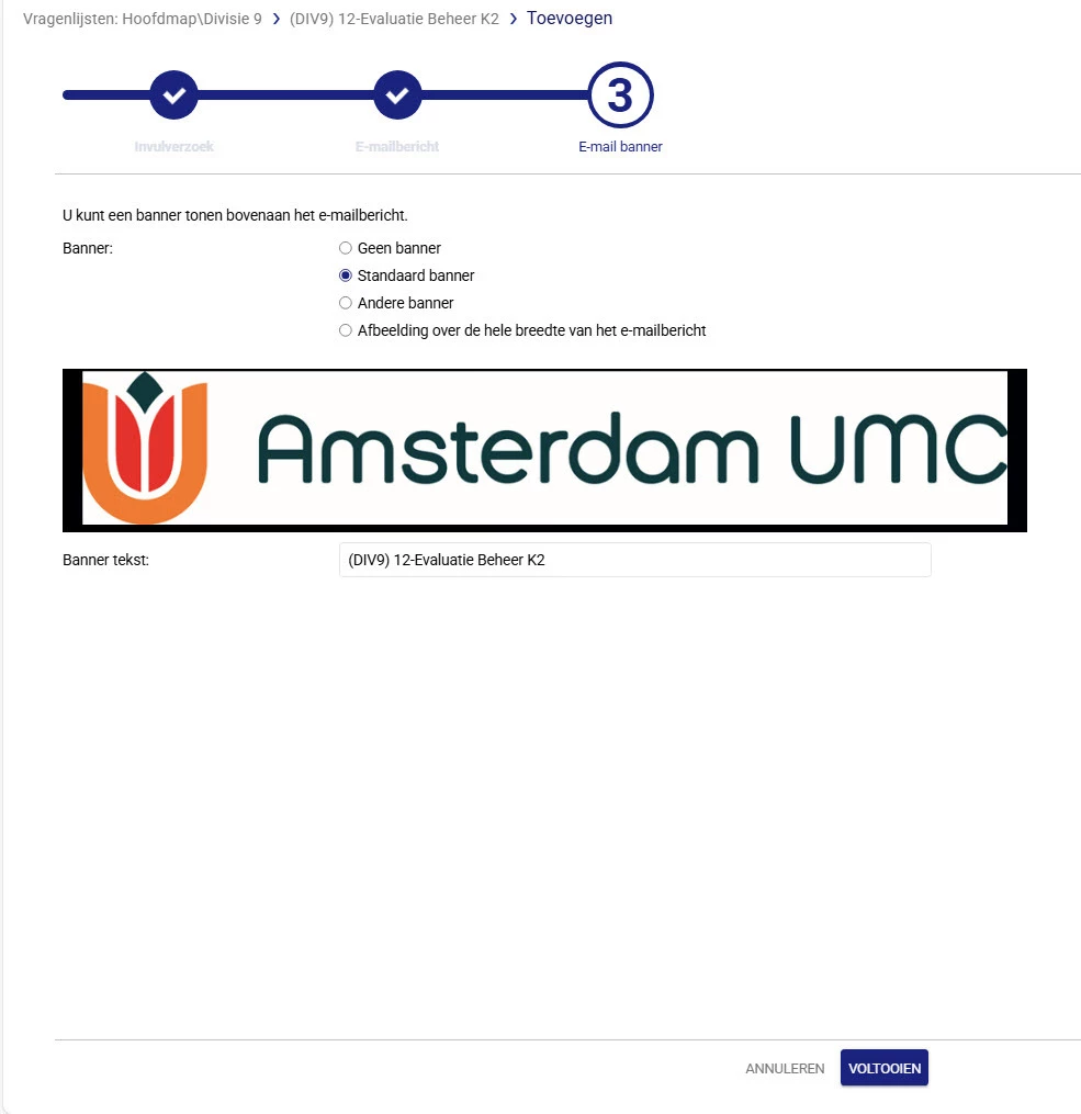 Binnen het Amsterdam UMC maken we gebruik van Zenya CHECK voor het versturen van vragenlijsten. Bij het versturen van e-mailuitnodigingen zien we dat er oa een keuze is tussen een standaard banner en een alternatieve banner die bovenaan het bericht wordt weergegeven.