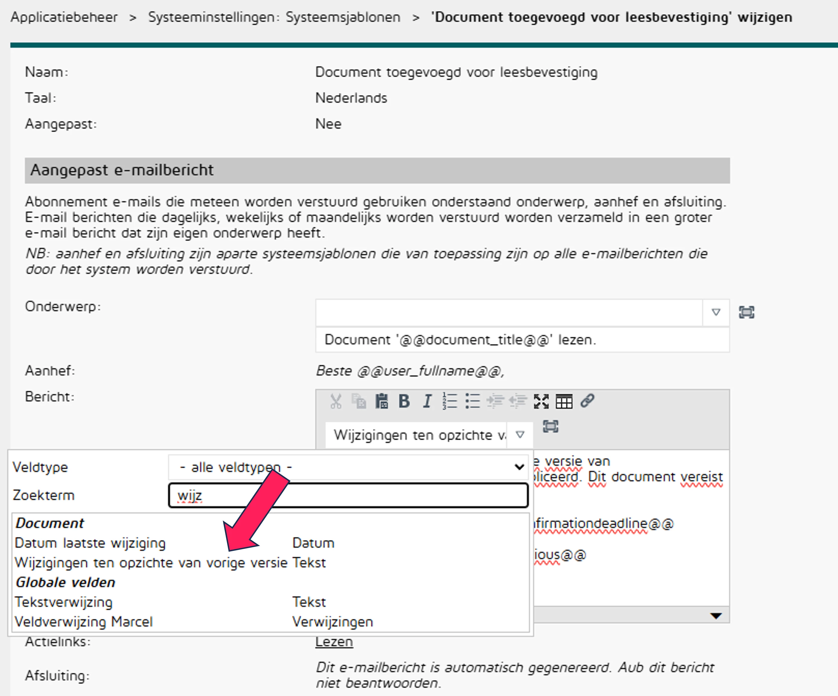 Er bestaat een wens om het veld "Wijzigingen tov vorige versie" toe te voegen aan de mailtekst bij het verzoek voor leesbevestiging. Dit om in 1 oogopslag al in de mail te zien waarom het belangrijk is de nieuwe versie te lezen en om vooral het lezen te stimuleren. Zijn er Zenya gebruikers die veel ervaring met het gebruik van de leesbevestiging hebben en zou dit een verbetering zijn? Hoor graag jullie input en evt. andere tips!