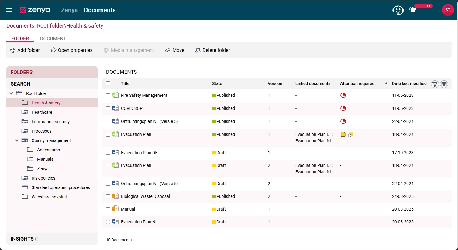 In Zenya DOC hebben wij een structuur van mappen opgezet. Binnen een hoofdmap zijn er meerdere sub-mappen en/of documenten aanwezig. Deze worden nu standaard op alfabetische volgorde getoond. Is er een mogelijkheid om de volgorde van getoonde mappen en of documenten handmatig in te stellen? Op deze wijze zouden we submappen en documenten kunnen groeperen en niet door elkaar heen laten tonen zoals nu. Voorbeeld: hofdmap "QESH” met de submappen “Quality”, “”Environment“, Safety” en “Health” en in dezelfde hoofdmap een document met de titel “Kwaliteitsborging”. Dit document komt op dit moment tussen de submappen “Health” en Quality” te staan. Dit is ongewenst.