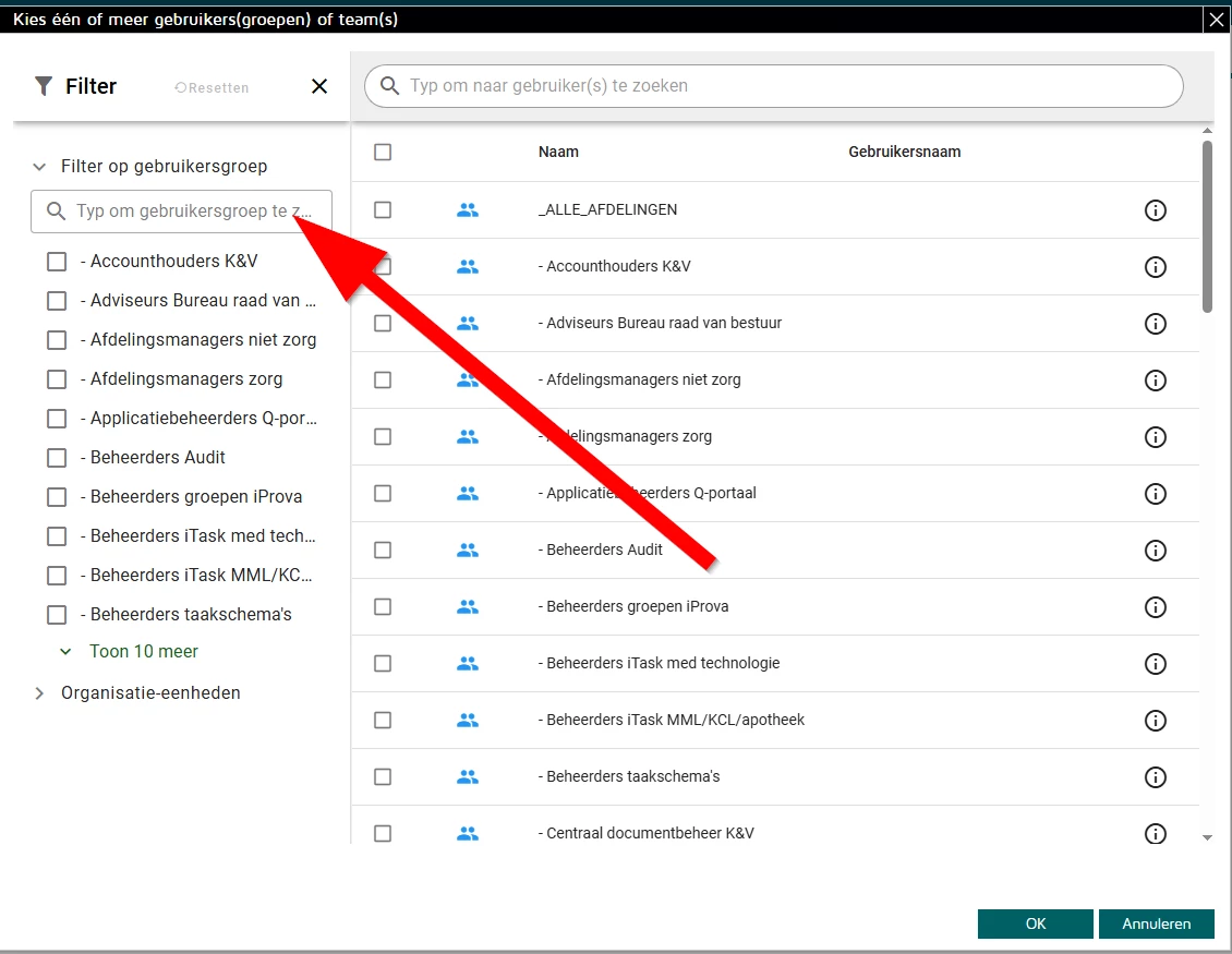 Mag ik hierover mijn feedback geven dat het nu bij iedere keer dat je dit wilt instellen + 3 klikken kost om een gebruikersgroep te selecteren? Dit is geen aanwinst voor de gebruiksvriendelijkheid en ik vind het ook niet intuïtief.. je eerste reactie is dat je in de zoekbalk gaat zoeken (want in de lijst eronder zie je ook de gebruikersgroepen staan al).