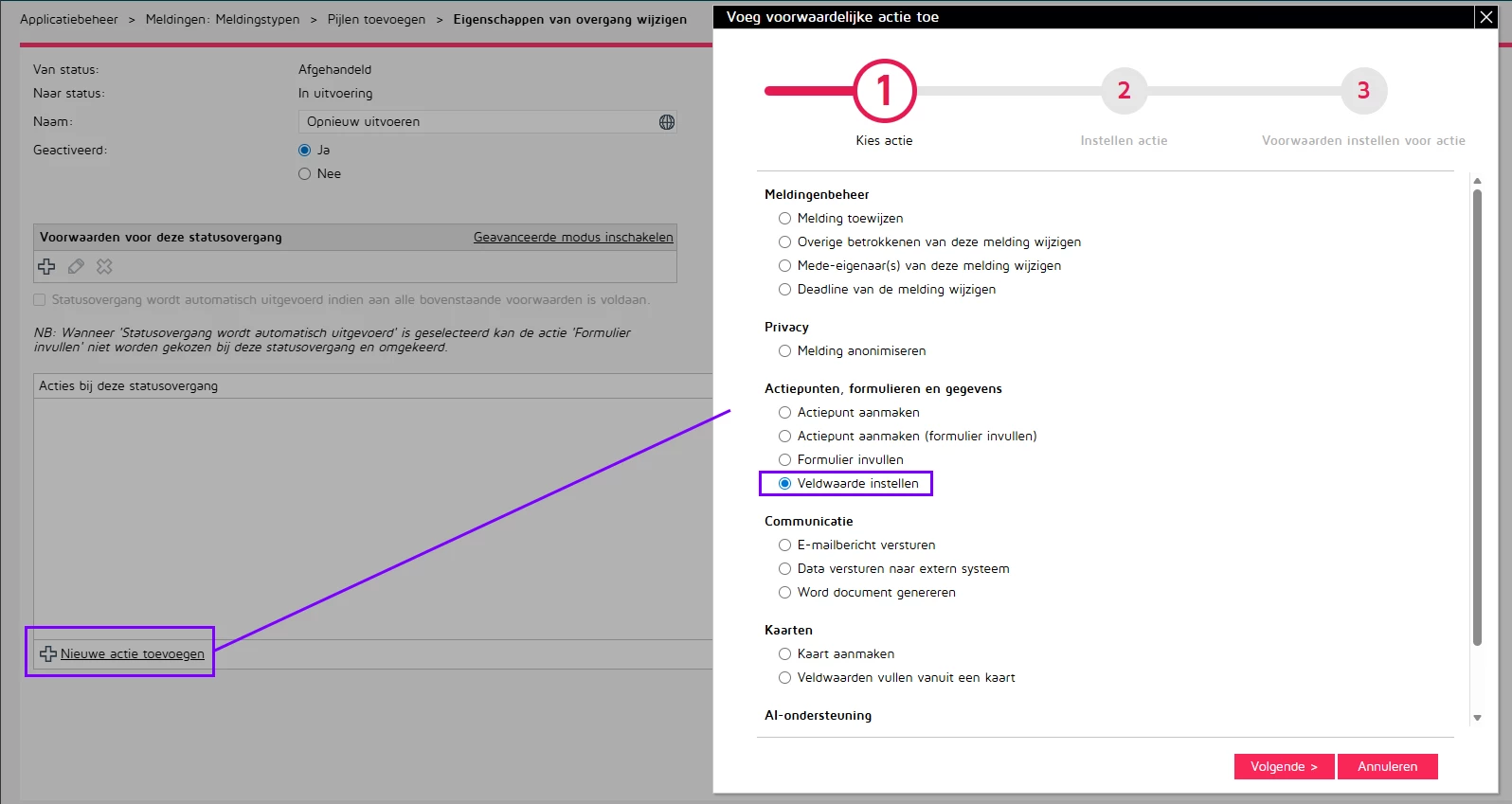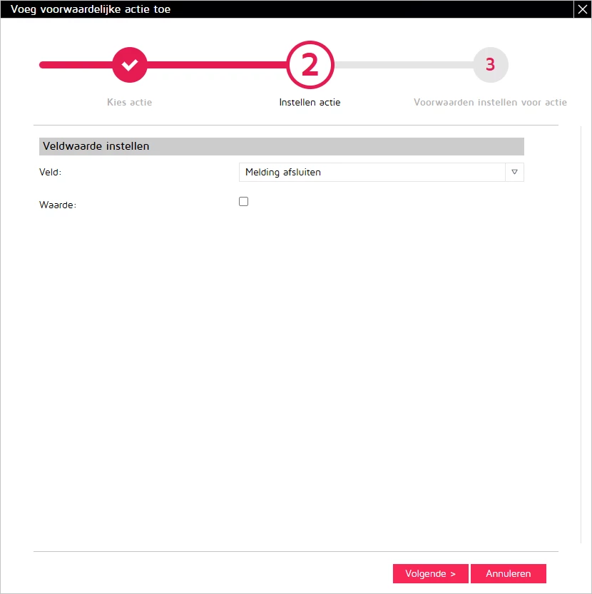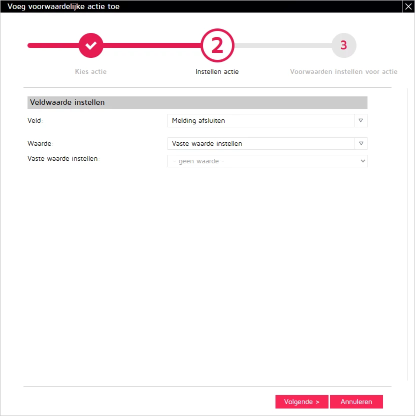 Voor keuzelijsten en tekstvelden kies je in de vervolgstap voor "vaste waarde instellen” en vervolgens vul je - geen waarde - in, zodat het veld leeggemaakt wordt als een melding heropend wordt: