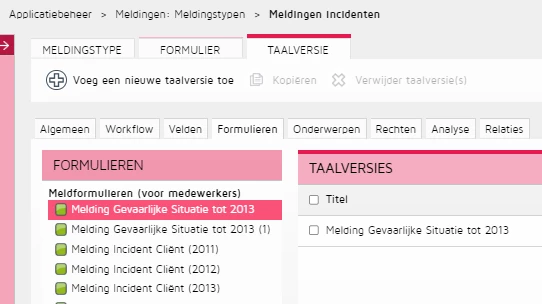 Je kunt het meldformulier niet verwijderen als er nog meldingen zijn die met dat formulier zijn gemaakt. Wat je kunt doen, is het formulier uitschakelen zodat er niet meer mee gemeld kan worden. Ook zou je ter verduidelijking de naam van het formulier kunnen aanpassen en bijvoorbeeld ‘Oud’ ervoor zetten.