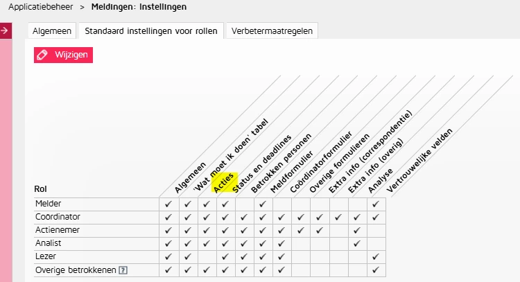 In het applicatiebeheer > Meldingen > Instellingen staan de standaard instellingen voor rollen benoemd. Wat kan een rol met het recht voor acties?