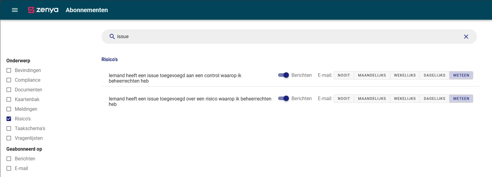 Mij lijkt het heel logisch dat een beheerder van een Risico en/of Control actief geïnformeerd wordt, zodra iemand een Issue eronder hangt. Kijk eerst goed naar de ingestelde beheerders van ieder afzonderlijk Risico en Control, voordat je de abonnementen zelf wijzigt. Een abonnementswijziging kan namelijk betekenen dat een beheerder geen bericht krijgt bij Risico's en Controls die wel onder de verantwoordelijkheid vallen van de betreffende beheerder.