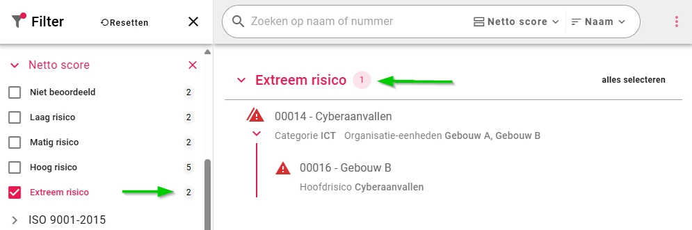 Achter het filter zie je het aantal ‘resultaten' dat he filter gaat opleveren, dat is in het plaatje bij ‘Extreem risico’ dan twee resultaten (het hoofd- en subrisico).