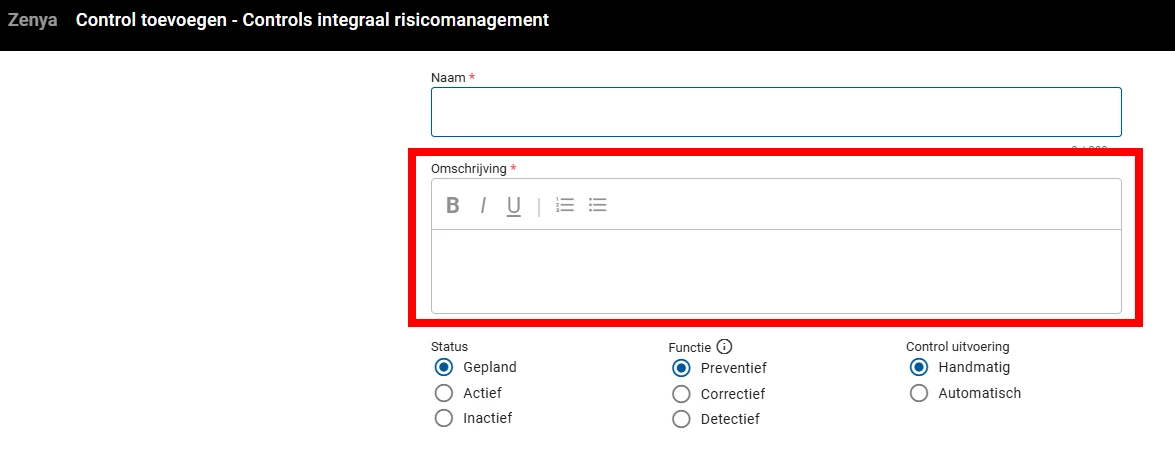 In de nieuwe Zenya RISK module is het bij controls verplicht om een omschrijving toe te voegen. We zien dat, zeker voor het integraal risicomanagement, deze control omschrijvingen vaak lastig te vullen zijn omdat de titel van de control de lading al dekt. Nu wordt vaak de titel van de control gekopieerd en geplakt naar de omschrijving. Is het mogelijk om de omschrijving bij een control een niet-verplicht veld te maken?